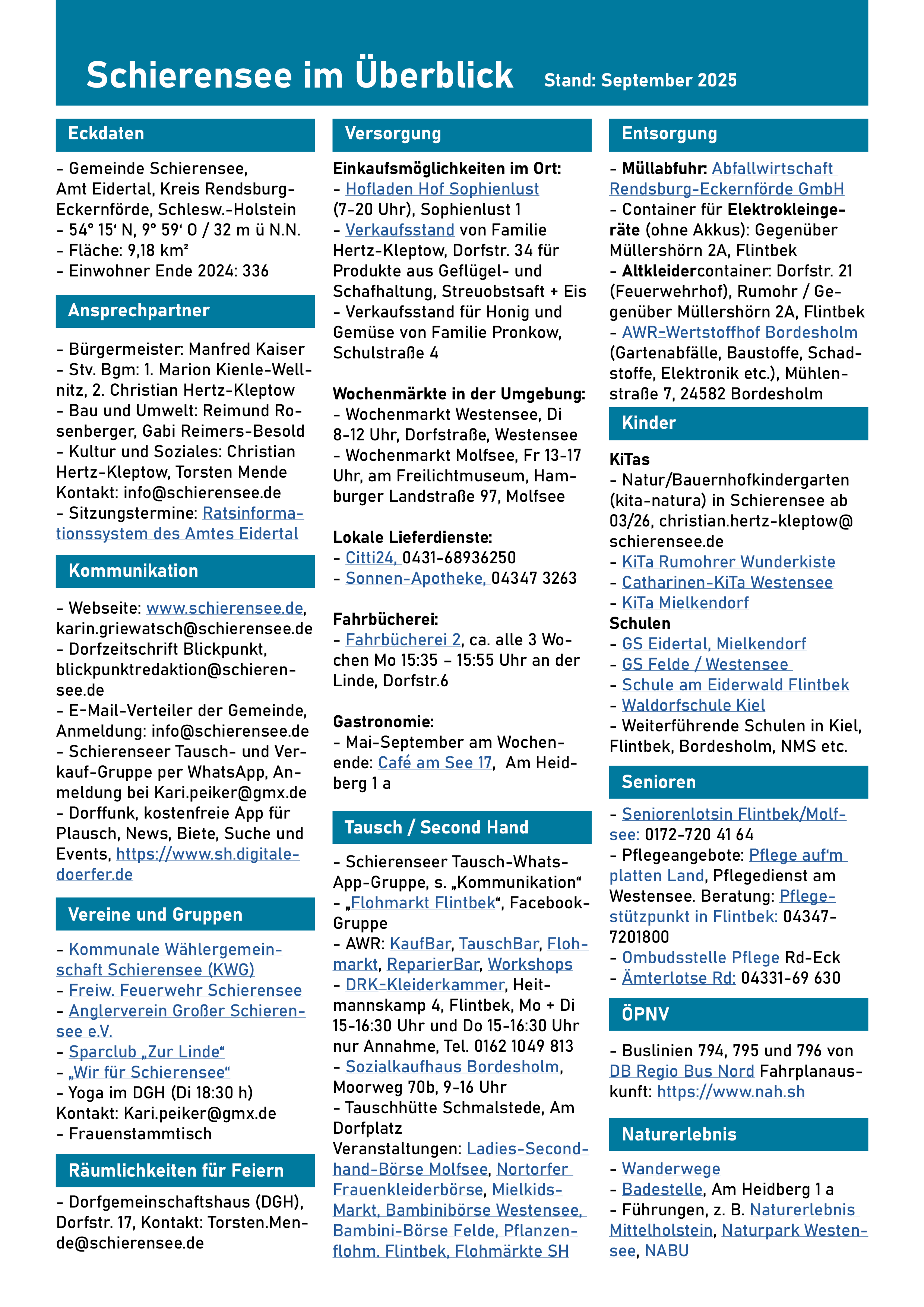 Wer ist in Schierensee wofür zuständig? Wie können wir uns austauschen? Was und wo kann ich in Schierensee einkaufen? Wer liefert nach Schierensee? Eine Übersicht dazu (und noch mehr) gibt es in dieser pdf-Datei (Stand September 2025):