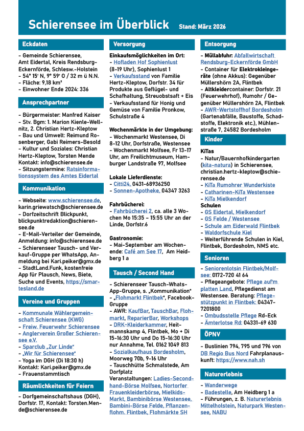 Wer ist in Schierensee wofür zuständig? Wie können wir uns austauschen? Was und wo kann ich in Schierensee einkaufen? Wer liefert nach Schierensee? Eine Übersicht dazu (und noch mehr) gibt es in dieser pdf-Datei (Stand November 2025):